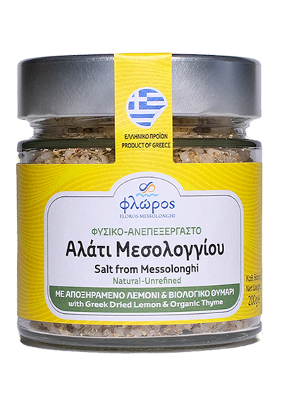 Αρωματικό, ελληνικό αποξηραμένο φυσικό λεμόνι σε τρίμα, συνδυάζεται με εξαιρετικό ελληνικό βιολογικό θυμάρι και μαζί προστίθενται στο φυσικό ανεπεξέργαστο αλάτι από τη λιμνοθάλασσα του Μεσολογγίου, δίνοντας ένα εκπληκτικό αποτέλεσμα.