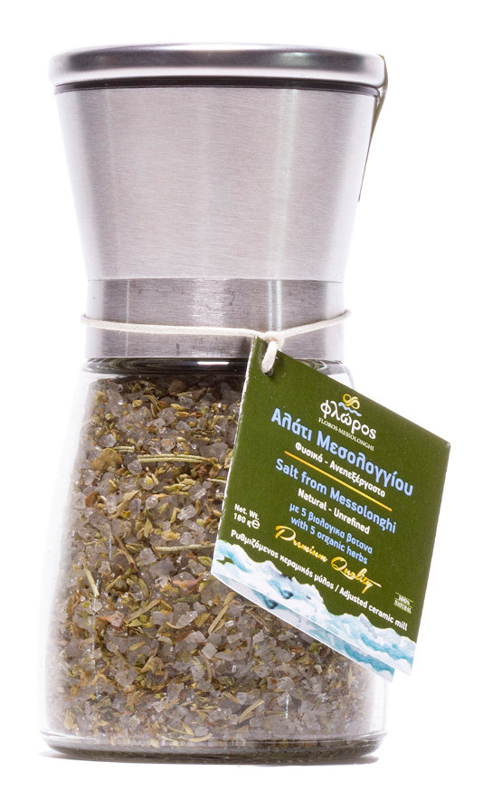 Ένα πάντρεμα των καλύτερων στοιχείων του βουνού και της θάλασσας! Φυσικό ανεπεξέργαστο αλάτι Μεσολογγίου με 5 βιολογικά βότανα (θυμάρι, ρίγανη, δυόσμο, ματζουράνα και δεντρολίβανο), κατευθείαν από τα βουνά της Ηπείρου. Τα βιολογικά αυτά βότανα μπλέκονται με το ανεπεξέργαστο αλάτι σε ένα εύχρηστο μίγμα, για κάθε χρήση, από σαλάτες και ωμά φαγητά έως ψητό ψάρι ή κρέας. Ένα ιδανικό και εύχρηστο μίγμα εξαιρετικών προϊόντων που θα τονίσουν την μαγειρική σας.